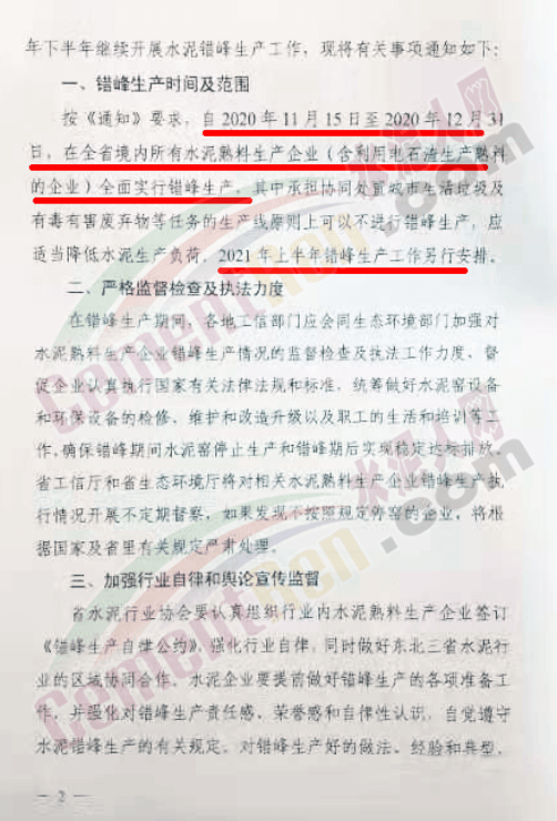 《通知》要求,自2020年11月15日至12月31日,在黑龍江省境內(nèi)所有水泥熟料生產(chǎn)企業(yè)(含利用電石渣生產(chǎn)熟料的企業(yè))全面實(shí)行錯(cuò)峰生產(chǎn),其中承擔(dān)協(xié)同處置城市生活垃圾及有毒有害廢棄物等任務(wù)的生產(chǎn)線原則上可以不進(jìn)行錯(cuò)峰生產(chǎn),應(yīng)適當(dāng)降低水泥生產(chǎn)負(fù)荷。