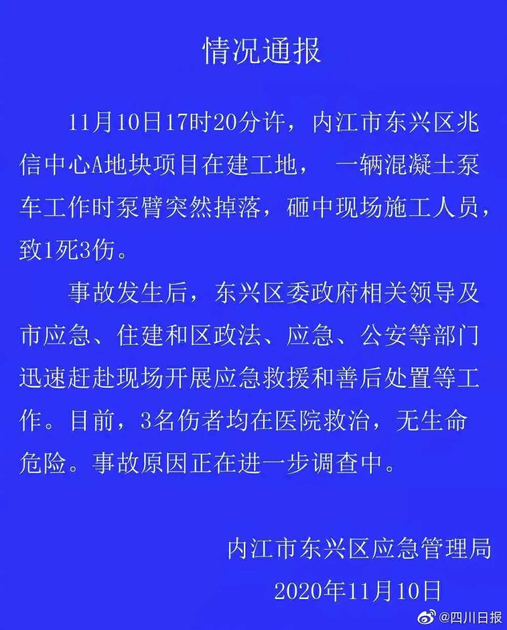 11月10日,有網(wǎng)友爆料稱(chēng),內(nèi)江市東興區(qū)兆信中心在建工地發(fā)生事故導(dǎo)致人員傷亡。記者從內(nèi)江市東興區(qū)應(yīng)急管理局處確認(rèn),11月10日17時(shí)20分許,內(nèi)江市東興區(qū)兆信中心A地塊項(xiàng)目在建工地,一輛混凝土泵車(chē)工作時(shí)泵臂突然掉落,砸中現(xiàn)場(chǎng)施工人員,致1死3傷。 內(nèi)江市東興區(qū)應(yīng)急管理局11月10日晚間發(fā)布情況通報(bào)稱(chēng),事故發(fā)生后,東興區(qū)委政府相關(guān)領(lǐng)導(dǎo)及市應(yīng)急、住建和區(qū)政法、應(yīng)急、公安等部門(mén)迅速趕赴現(xiàn)場(chǎng)開(kāi)展應(yīng)急救援和善后處置等工作。目前,3名傷者均在醫(yī)院救治,無(wú)生命危險(xiǎn)。事故原因正在進(jìn)一步調(diào)查中。