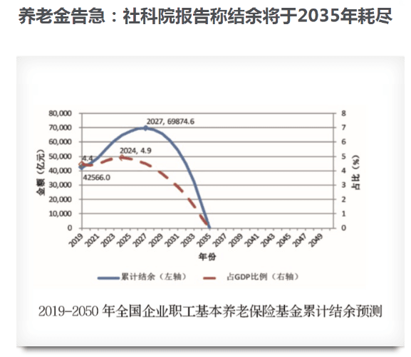 中國(guó)社科院世界社保研究中心發(fā)布《中國(guó)養(yǎng)老金精算報(bào)告2019~2050》(以下簡(jiǎn)稱(chēng)《報(bào)告》)?!秷?bào)告》預(yù)測(cè),未來(lái)30年我國(guó)的制度贍養(yǎng)率翻倍,2019年當(dāng)期結(jié)余總額為1062.9億元,不過(guò)到2028年,當(dāng)期結(jié)余可能會(huì)首次出現(xiàn)負(fù)數(shù),為負(fù)1181.3億元。《報(bào)告》同時(shí)指出,城鎮(zhèn)職工基本養(yǎng)老保險(xiǎn)基金累計(jì)結(jié)余到2027年有望達(dá)到峰值6.99萬(wàn)億元,然后開(kāi)始下降,到2035年有耗盡累計(jì)結(jié)余的可能性。