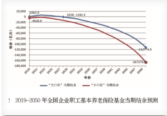 《報(bào)告》預(yù)測(cè),2019~2050年,全國(guó)城鎮(zhèn)企業(yè)職工基本養(yǎng)老保險(xiǎn)基金當(dāng)期結(jié)余在勉強(qiáng)維持幾年的正數(shù)后,將開(kāi)始加速跳水,赤字規(guī)模越來(lái)越大。具體來(lái)看,2019年當(dāng)期結(jié)余為1062.9億元,并將短暫增長(zhǎng)到2022年,然后從2023年開(kāi)始下降,到2028年當(dāng)期結(jié)余會(huì)首次出現(xiàn)負(fù)數(shù),達(dá)到負(fù)1181.3億元,最終到2050年,當(dāng)期結(jié)余可能達(dá)到負(fù)11.28萬(wàn)億元。