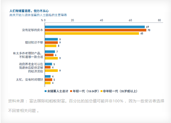 從圖表分析結(jié)果來(lái)看,2018年尚有44%的受訪者表示有信心(包含“非常自信”和“較為自信”)在工作生涯結(jié)束時(shí)攢夠足夠儲(chǔ)蓄,2018年這一比例已經(jīng)降至32%。甚至在已經(jīng)開(kāi)始儲(chǔ)蓄的受訪者中,對(duì)達(dá)成退休儲(chǔ)蓄目標(biāo)充滿(mǎn)信心的受訪者比例也從2018年的55%降至今年的40% ,只有少數(shù)受訪者 (6%) 依舊表示高度自信 。上述一系列的調(diào)查結(jié)果可能表明,在經(jīng)濟(jì)增長(zhǎng)放緩和全球貿(mào)易緊張局勢(shì)的環(huán)境中,不安感正在日益加劇 。所以受訪者降低了退休儲(chǔ)蓄預(yù)期,連同實(shí)現(xiàn)退休儲(chǔ)蓄目標(biāo)的信心也略有下降 。但禍福相依,人們可能也因此意識(shí)到需要尋求建議或接受金融教育,來(lái)彌補(bǔ)財(cái)務(wù)規(guī)劃能力方面的不足?,F(xiàn)在作為社會(huì)勞動(dòng)者主力的年輕人,已經(jīng)想著退休了。年輕人為啥不愿意上班呢?因?yàn)樯习嗵哿恕?/p>