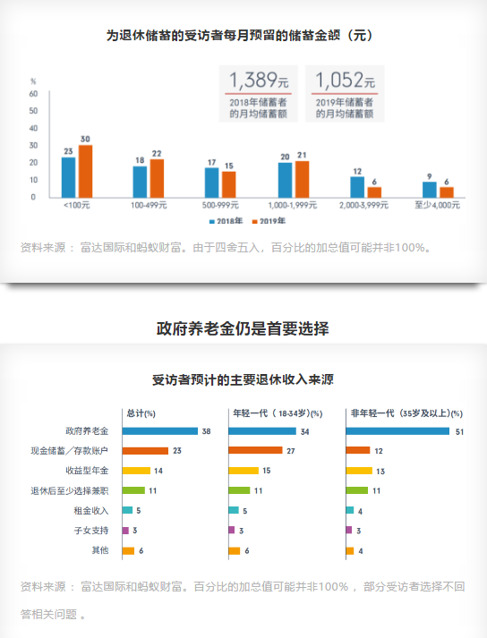 根據(jù)調(diào)查報(bào)告顯示,盡管越來(lái)越多的人開(kāi)始為退休儲(chǔ)蓄,但他們的儲(chǔ)蓄額在下降 。2018年人們每月儲(chǔ)蓄月收入的21%(1,389元)作為退休準(zhǔn)備,但2019年這一比例降卻至17%(1,052元)。