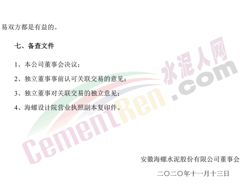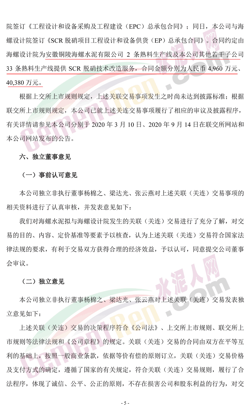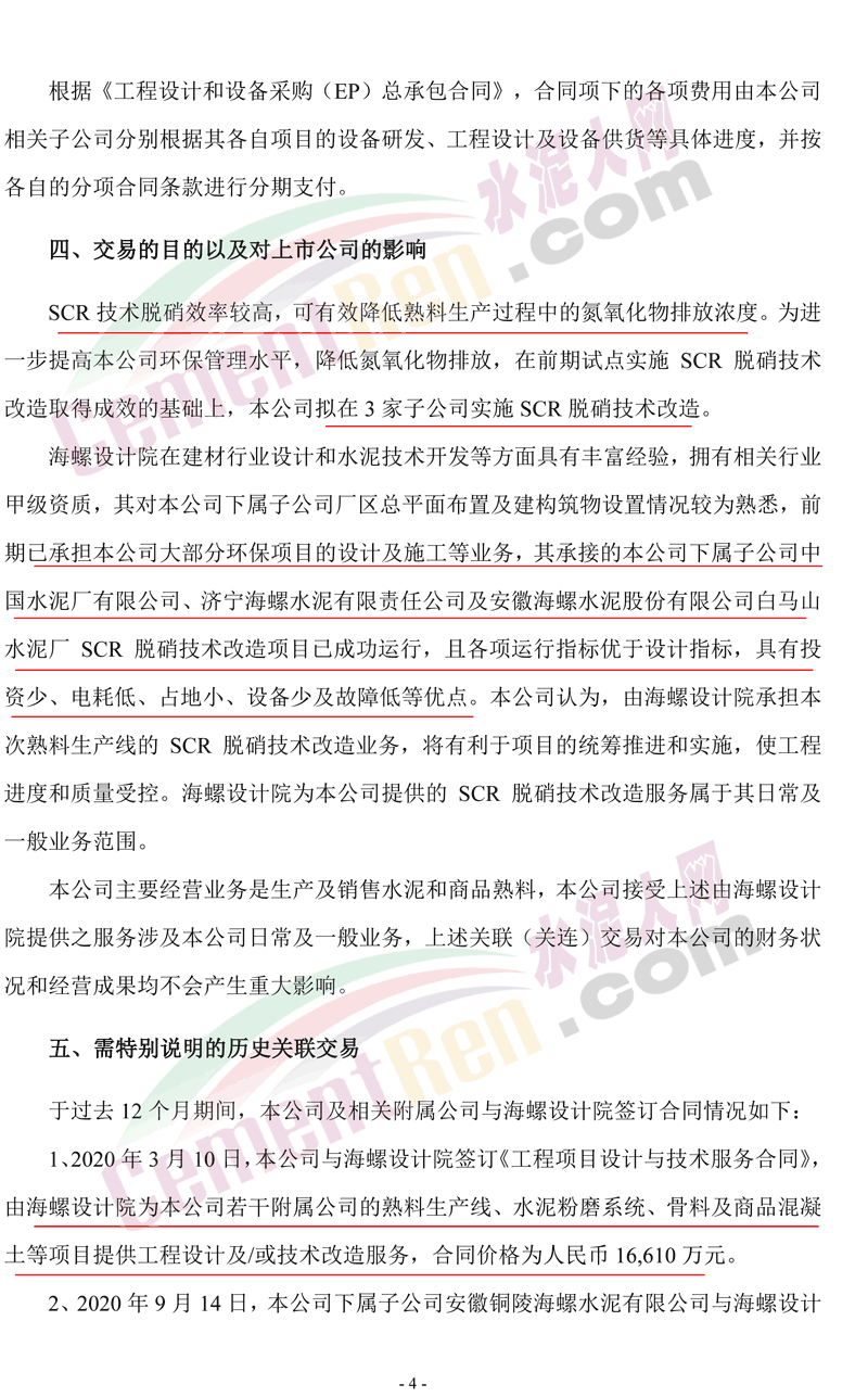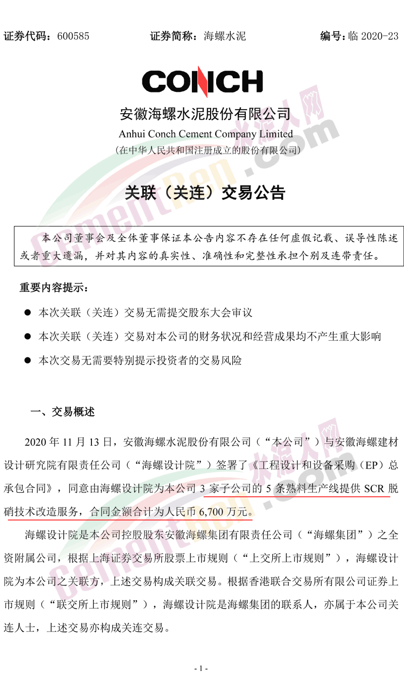同日,公司下屬全資子公司銅陵海螺與海螺設(shè)計(jì)院簽署了《工程設(shè)計(jì)和設(shè)備采購及工程建設(shè)(EPC)總承包合同》,根據(jù)該合同,海螺設(shè)計(jì)院將為銅陵海螺2條熟料生產(chǎn)線SCR脫硝技術(shù)改造項(xiàng)目提供設(shè)備研發(fā)、工程設(shè)計(jì)、設(shè)備供貨、建筑安裝、工程監(jiān)理及工程管理等服務(wù),合同價(jià)格為人民幣4960萬元。上述兩項(xiàng)合同價(jià)格合計(jì)為人民幣45340萬元。公告原文如下: