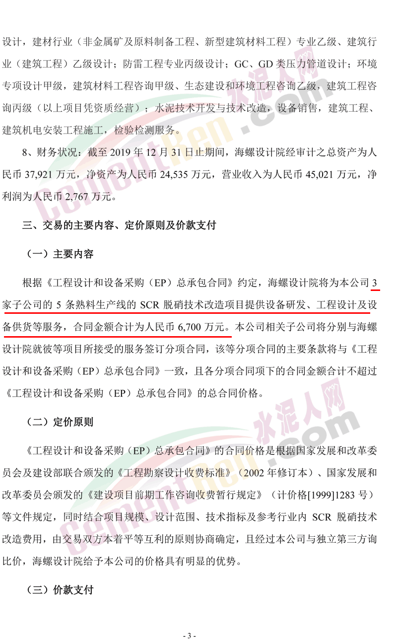 根據(jù)《工程設(shè)計(jì)和設(shè)備采購(EP)總承包合同》約定,海螺設(shè)計(jì)院將為公司3家子公司的5條熟料生產(chǎn)線的SCR脫硝技術(shù)改造項(xiàng)目提供設(shè)備研發(fā)、工程設(shè)計(jì)及設(shè)備供貨等服務(wù),合同金額合計(jì)為人民幣6,700萬元。公司相關(guān)子公司將分別與海螺設(shè)計(jì)院就彼等項(xiàng)目所接受的服務(wù)簽訂分項(xiàng)合同,該等分項(xiàng)合同的主要條款將與《工程設(shè)計(jì)和設(shè)備采購(EP)總承包合同》一致,且各分項(xiàng)合同項(xiàng)下的合同金額合計(jì)不超過《工程設(shè)計(jì)和設(shè)備采購(EP)總承包合同》的總合同價(jià)格。