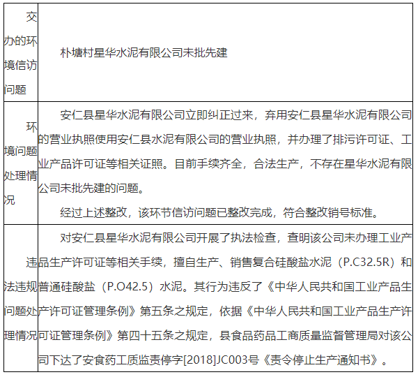 目前手續(xù)齊全,合法生產(chǎn),不存在星華水泥有限公司未批先建的問題。經(jīng)過上述整改,該環(huán)節(jié)信訪問題已整改完成,符合整改銷號標(biāo)準(zhǔn)。