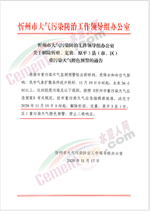山西忻州市于11月19日0時(shí)起,解除忻府、定囊、平原3縣重污染天氣橙色預(yù)警,停止二級響應(yīng)。