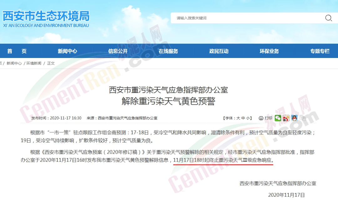 11月17日16時(shí),西安市重污染天氣應(yīng)急指揮部辦公室發(fā)布消息,17-18日,受冷空氣和降水共同影響,濕清除條件有利,預(yù)計(jì)空氣質(zhì)量為良至輕度污染。根據(jù)相關(guān)規(guī)定,西安市重污染天氣黃色預(yù)警解除,11月17日18時(shí)起終止重污染天氣Ⅲ級應(yīng)急響應(yīng)。
