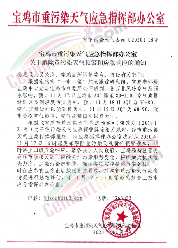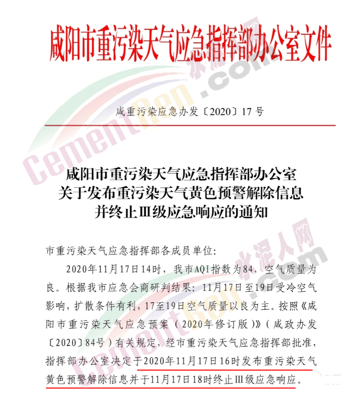 2020年11月17日14時(shí),咸陽市AQI指數(shù)為84,空氣質(zhì)量為良。根據(jù)咸陽市應(yīng)急會商研判結(jié)果:11月17日至19日受冷空氣影響,擴(kuò)散條件有利,17至19日空氣質(zhì)量以良為主。按照《咸陽市重污染天氣應(yīng)急預(yù)案(2020年修訂版)》(咸政辦發(fā)〔2020〕84號)有關(guān)規(guī)定,經(jīng)咸陽市重污染天氣應(yīng)急指揮部批準(zhǔn),指揮部辦公室決定于2020年11月17日16時(shí)發(fā)布重污染天氣黃色預(yù)警解除信息并于11月17日18時(shí)終止Ⅲ級應(yīng)急響應(yīng)。