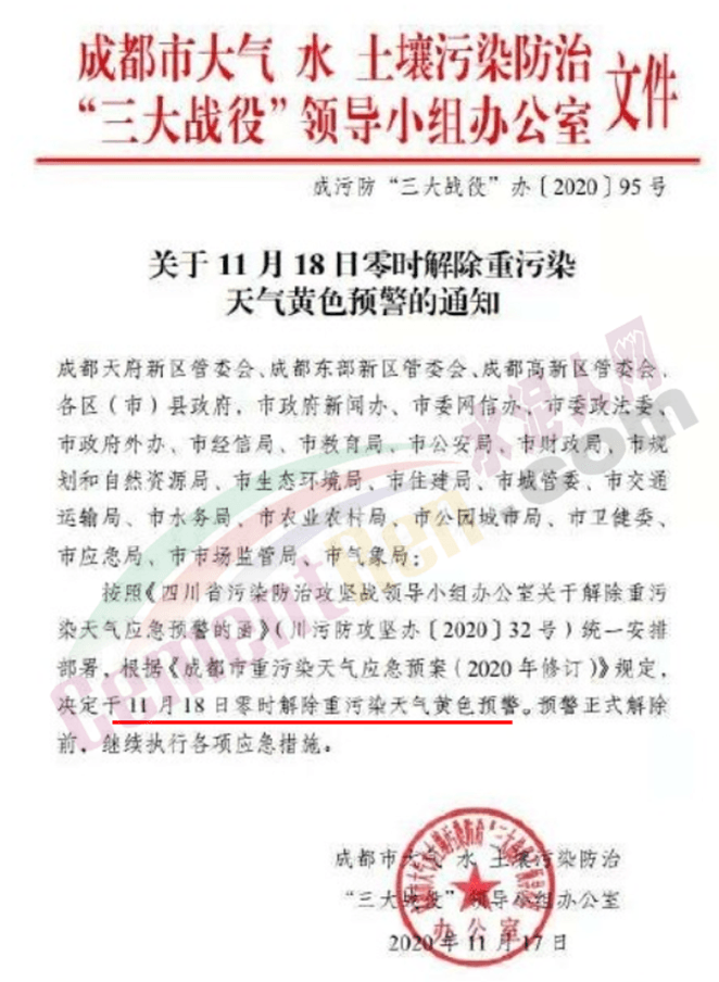 根據(jù)四川省環(huán)境監(jiān)測總站與省氣象臺聯(lián)合會商研判,我省盆地區(qū)域污染氣象條件逐漸好轉(zhuǎn),按照《四川省重污染天氣應(yīng)急預(yù)案(2018年修訂)》規(guī)定,建議成都、自貢、瀘州、德陽、綿陽、內(nèi)江、樂山、眉山、宜賓、資陽于11月18日零時(shí)解除自10日啟動的重污染天氣黃色預(yù)警。具體情況各城市可根據(jù)當(dāng)?shù)匦蝿菅信袥Q定。