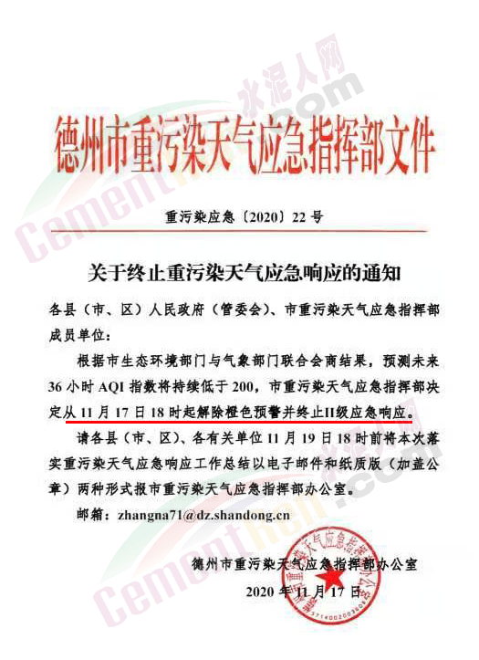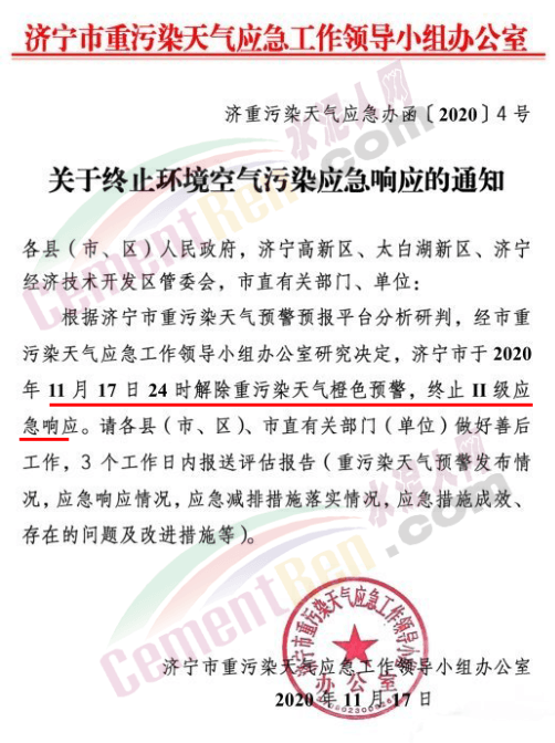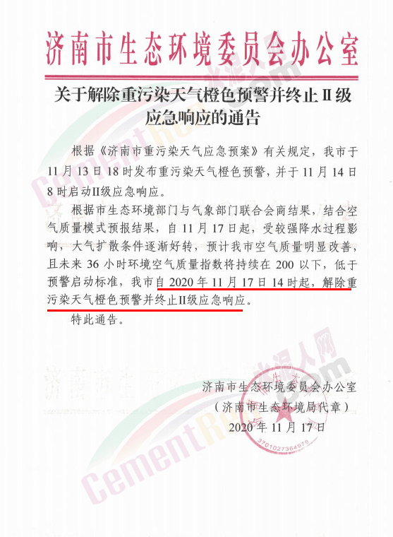 11月17日24時(shí)橙警解除!根據(jù)濟(jì)寧市重污染天氣預(yù)警預(yù)報(bào)平臺分析研判,經(jīng)市重污染天氣應(yīng)急工作領(lǐng)導(dǎo)小組辦公室研究決定,濟(jì)寧市于2020年11月17日24時(shí)解除重污染天氣橙色預(yù)警,終止II級應(yīng)急響應(yīng)。