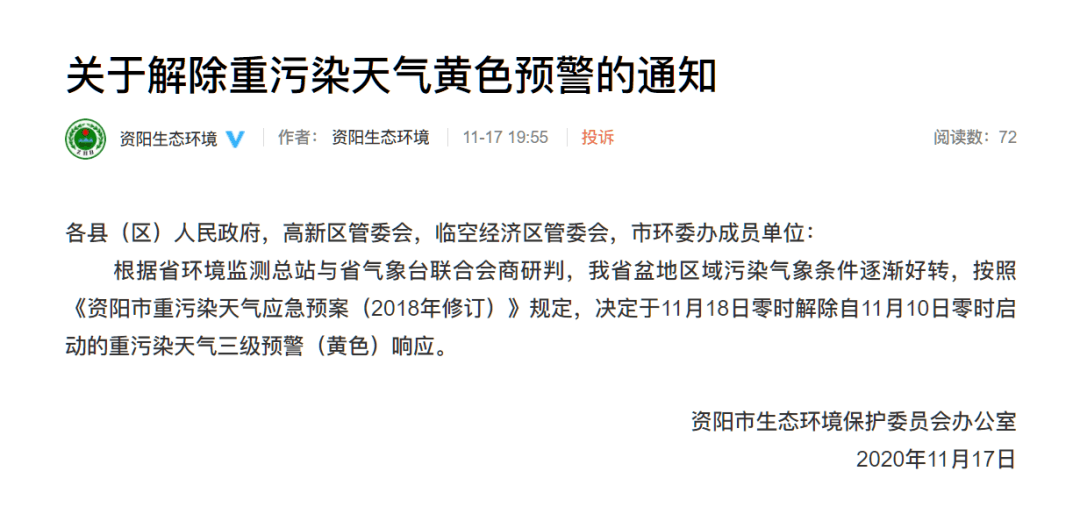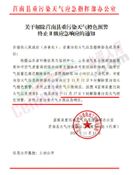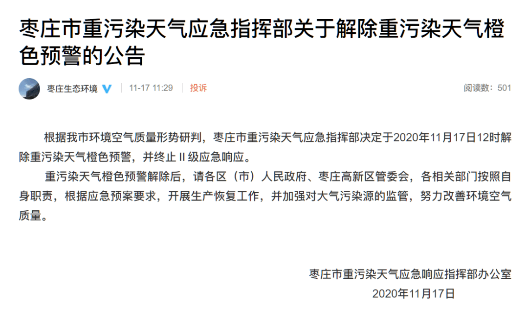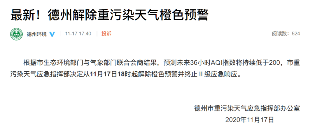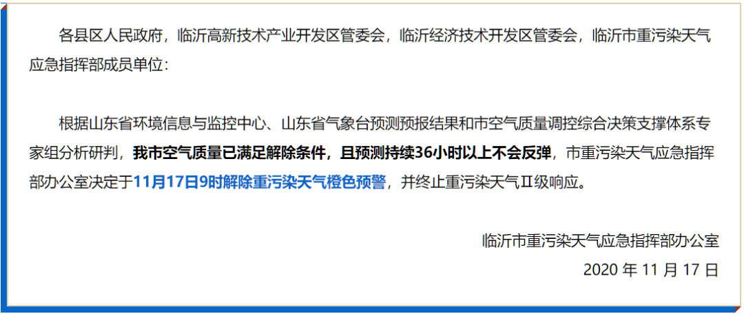 根據(jù)空氣質(zhì)量狀況,泰安市重污染天氣應(yīng)急工作小組決定,自2020年11月17日9時(shí)起,在全市范圍內(nèi),解除重污染天氣橙色預(yù)警,同時(shí)解除Ⅱ級應(yīng)急響應(yīng)。