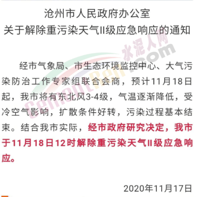 11月17日,河北滄州市人民政府辦公室發(fā)布關(guān)于解除重污染天氣Ⅱ級應(yīng)急響應(yīng)的通知稱,經(jīng)市氣象局、市生態(tài)環(huán)境監(jiān)控中心、大氣污染防治工作專家組聯(lián)合會商,預(yù)計(jì)11月18日起,滄州市將有東北風(fēng)3-4級,氣溫逐漸降低,受冷空氣影響,擴(kuò)散條件好轉(zhuǎn),污染過程基本結(jié)束。結(jié)合滄州市實(shí)際,經(jīng)市政府研究決定,滄州市于11月18日12時(shí)解除重污染天氣Ⅱ級應(yīng)急響應(yīng)。