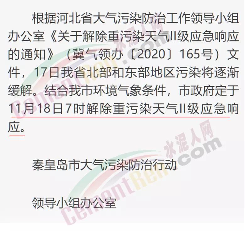 秦皇島市大氣污染防治行動領(lǐng)導(dǎo)小組辦公室通知,根據(jù)河北省大氣污染防治工作領(lǐng)導(dǎo)小組辦公室《關(guān)于解除重污染天氣II級應(yīng)急響應(yīng)的通知》(冀氣領(lǐng)辦〔2020〕165號)文件,17日河北省北部和東部地區(qū)污染將逐漸緩解。結(jié)合我市環(huán)境氣象條件,市政府定于11月18日7時(shí)解除重污染天氣II級應(yīng)急響應(yīng)。