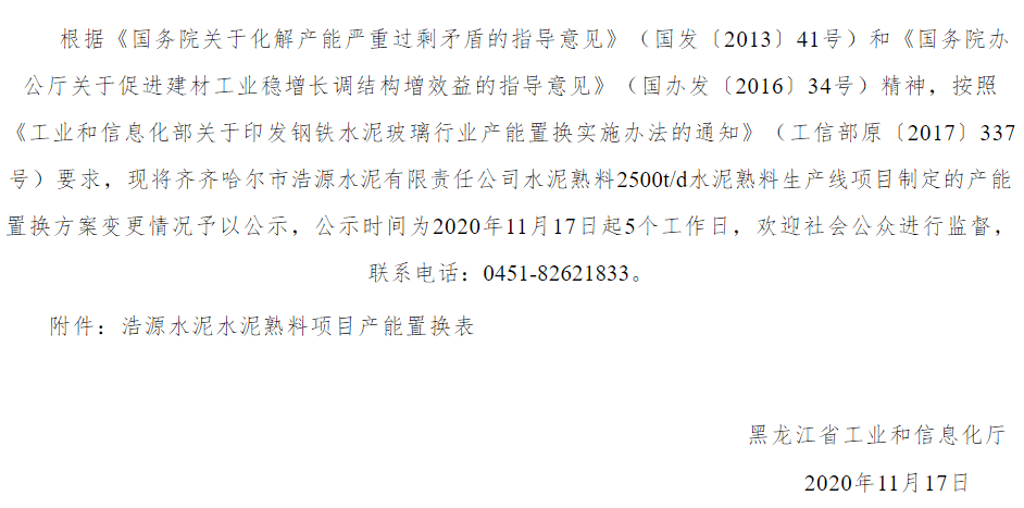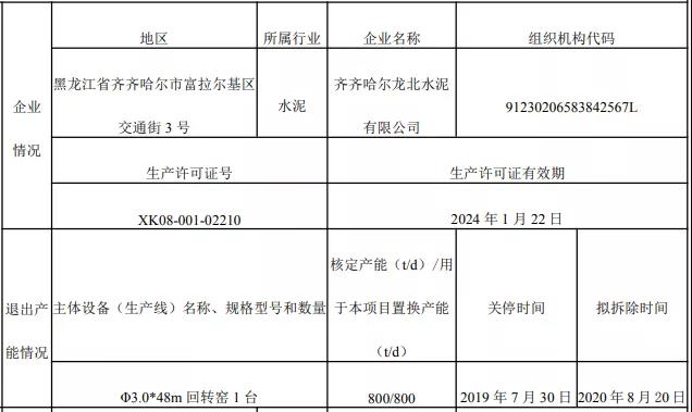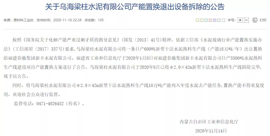 同期, 內蒙古自治區(qū)工信廳發(fā)布《關于烏海梁柱水泥有限公司產能置換退出設備拆除的公告》 公告稱,根據(jù)相關文件要求,烏海梁柱水泥有限公司將一條600t/d噸熟料生產線(年產能18萬噸)出讓置換給福建春馳集團新豐水泥有限公司,用于新建一條日產5500噸的新型干法水泥熟料生產線(窯徑Ф4.6m)。