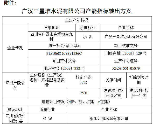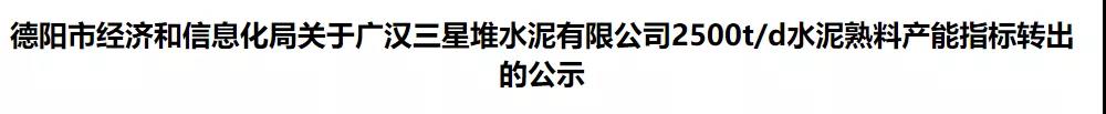 同日四川德陽市經信局發(fā)布廣漢三星堆水泥有限公司2500t/d水泥熟料產能轉出公示,用于敘永紅獅水泥新建生產線。
