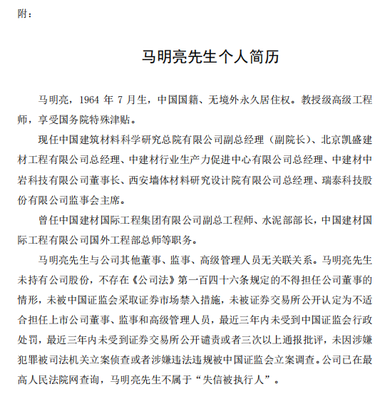 1、胡也明離職總裁職位,離職時間為2020年11月17日,離職原因為:工作變動。2、付貴平上任副總經(jīng)理職位,上任時間為2020年11月17日。3、馬明亮上任總裁職位,上任時間為2020年11月17日。中材節(jié)能股份有限公司是中材集團旗下從事余熱、余壓利用的余熱發(fā)電全方位服務(wù)商。中材節(jié)能致力于工業(yè)余熱、余壓的技術(shù)開發(fā)、綜合利用和產(chǎn)業(yè)化,擁有該領(lǐng)域及相關(guān)領(lǐng)域的設(shè)計、對外貿(mào)易經(jīng)營以及對外工程總承包等各類經(jīng)營資質(zhì),主要從事余熱發(fā)電項目的投資、技術(shù)開發(fā)、系統(tǒng)集成、工程設(shè)計、咨詢及工程總承包,提供清潔發(fā)展機制項目的開發(fā)方案及技術(shù)咨詢.中材節(jié)能也是經(jīng)國家商務(wù)部批準的承包境外低溫余熱發(fā)電系統(tǒng)工程和境內(nèi)國際招標工程等業(yè)務(wù)的公司。