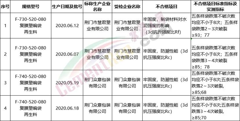 抽查結(jié)果顯示,水泥包裝。抽查全省29家企業(yè)生產(chǎn)的60批次水泥包裝袋,檢測發(fā)現(xiàn)4批次產(chǎn)品不合格,不合格發(fā)現(xiàn)率為6.67%。不合格項目為牢固度、防潮性,屬一般不合格。