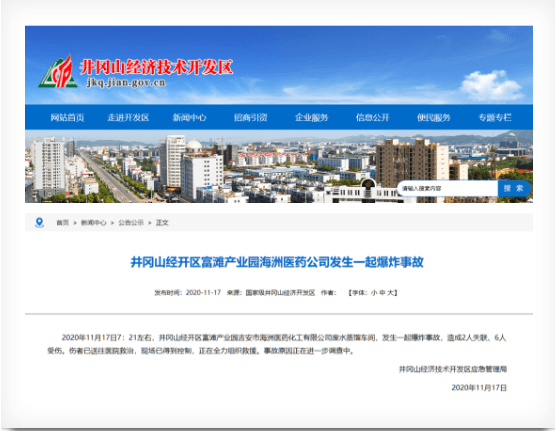 17日7時(shí)21分左右,江西吉安市海州醫(yī)藥化工有限公司廢水蒸餾車間發(fā)生爆炸。目擊者稱,地面上滿是被炸飛的磚頭。事發(fā)后,井岡山經(jīng)濟(jì)技術(shù)開(kāi)發(fā)區(qū)應(yīng)急管理局通報(bào)稱,事故致2人失聯(lián)、6人受傷。傷者已送往醫(yī)院救治,現(xiàn)場(chǎng)已得到控制,正在全力組織救援?! ?8日,江西省應(yīng)急管理廳發(fā)布消息稱,爆炸中2名失聯(lián)者確認(rèn)遇難,遺體分別于17日10時(shí)34分和15時(shí)找到,至此事故共造成2人死亡、1人重傷、5人輕傷。具體事故原因還在進(jìn)一步調(diào)查中。
