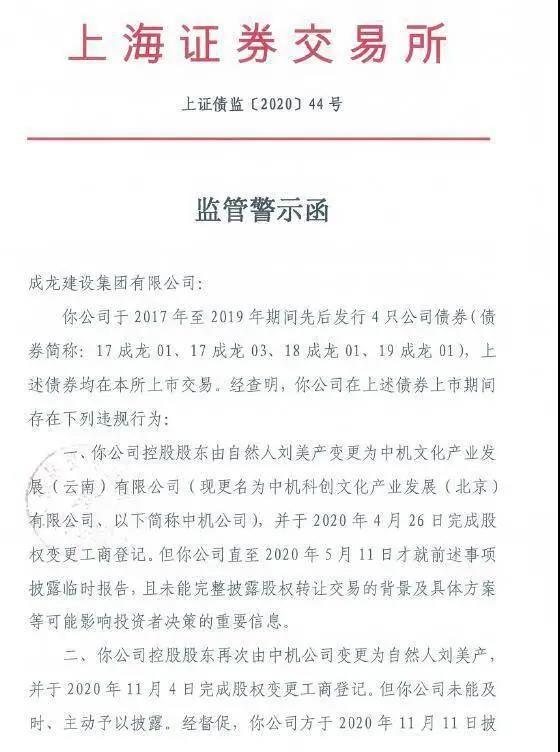 11月13日,上交所公告,因未能及時(shí)、完整披露重要信息,對成龍建設(shè)集團(tuán)有限公司予以監(jiān)管警示。同一天,成龍建設(shè)集團(tuán)公告稱,“17成龍03”公司債券構(gòu)成違約。該債券于11月13日應(yīng)兌付回售本金1.91億元、第三個(gè)付息年度利息1520萬元,合計(jì)2.06億元。由于公司經(jīng)營困難,無法按期支付這部分到期的本息,實(shí)際違約。