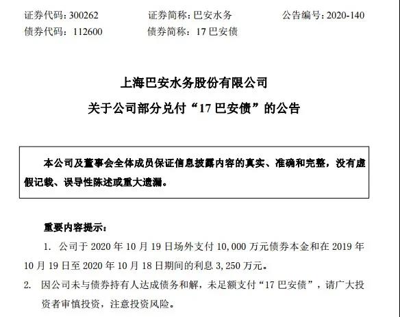 10月19日,巴安水務(wù)公告稱,因公司可用貨幣資金有限,短期內(nèi)無法完成資金回籠,無法按時(shí)足額支付“17巴安債”的本金及利息。利息3250萬元,尚存票面金額為39998萬元的資金缺口,無法按期支付,公司將會(huì)積極與債券持有人達(dá)成債務(wù)和解。