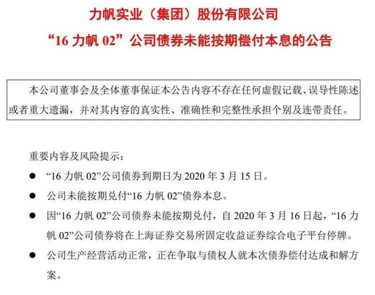 3月15日,力帆股份公告提到,“16力帆02”公司債券到期日為2020年3月15日,由于公司資金流動(dòng)性緊張,公司未能按期兌付“16力帆02”公司債券本息,“16力帆02”公司債券自3月16日起將在上海證券交易所固定收益證券綜合電子平臺(tái)停牌。截至2020年3月15日,共有5.303億元債券因無法按時(shí)兌現(xiàn)而逾期。