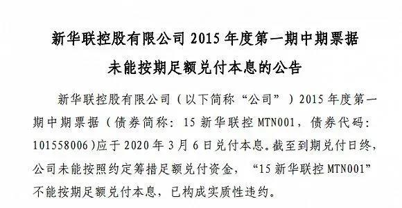 11月4日,海通證券公告稱,截至11月2日兌付日,仍未能收到“19新華聯(lián)控MTN001”兌付利息3500萬,該中票構(gòu)成實(shí)質(zhì)違約。