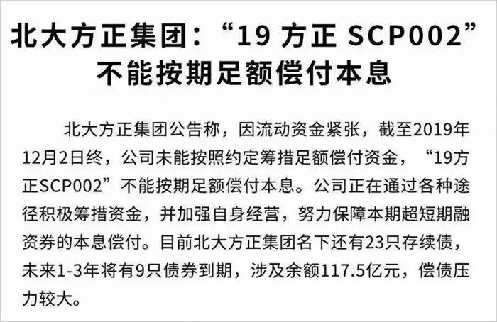 2月21日,上海清算所公告稱,截至2月21日日終,仍未收到北大方正支付的付息兌付資金,無法代理發(fā)行人進(jìn)行本期債券的付息兌付工作,即北大方正” 19方正SCP002”債券在展期后正式違約。截至2019年11月,北大方正累計(jì)發(fā)行債券64只,目前存續(xù)23只,存續(xù)債券余額合計(jì)345.4億元。