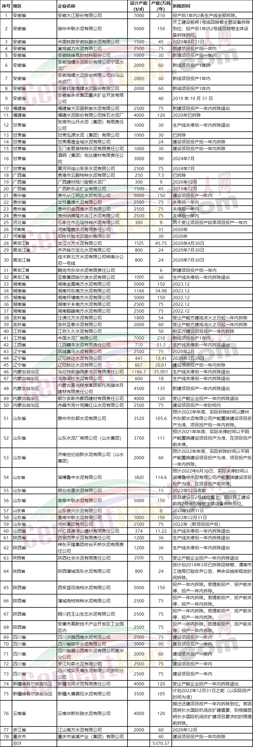 據(jù)水泥人網(wǎng)不完全統(tǒng)計(jì),自2020年以來(lái),各地工信廳發(fā)布的產(chǎn)能置換情況來(lái)看,關(guān)停的水泥企業(yè)共78家,涉及產(chǎn)能5370.37萬(wàn)噸,拆除及關(guān)停時(shí)示如下所示: