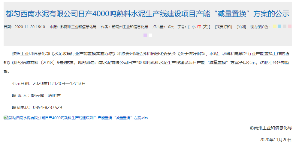 日前,貴州省黔南布依族苗族自治州工業(yè)和信息化局官網(wǎng)發(fā)布《都勻西南水泥有限公司日產(chǎn)4000噸熟料水泥生產(chǎn)線建設(shè)項目產(chǎn)能“減量置換”方案的公示》 。公示顯示,都勻西南水泥有限公司將通過退出貴州中誠水泥有限公司和貴州三都西南水泥有限公司兩條2500t/d熟料生產(chǎn)線,新建一條4000t/d新型干法熟料生產(chǎn)線。