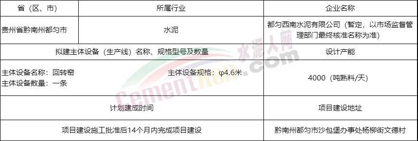 新建項目主體設(shè)備回轉(zhuǎn)窯直徑φ4.6米,設(shè)計產(chǎn)能4000t/d,建設(shè)地址位于黔南州都勻市沙包堡辦事處楊柳街文德村,將于項目建設(shè)施工批準后14個月內(nèi)完成項目建設(shè)。詳情如下: