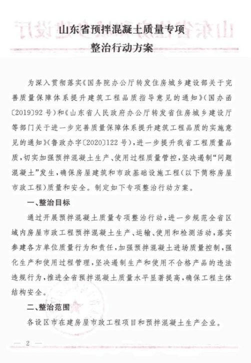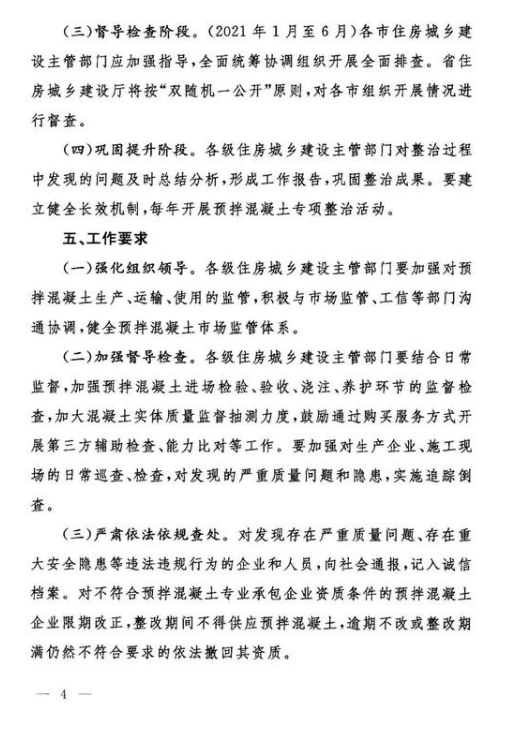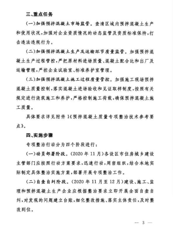 僅過月余,11月6日,省住建廳再次印發(fā)關(guān)于《山東省預(yù)拌混凝土質(zhì)量專項整治行動方案》的通知,對于預(yù)拌混凝土專項整治工作給出具體的重點任務(wù)、實施步驟以及工作要求。通知要求在全省各設(shè)區(qū)市范圍,從混凝土的市場監(jiān)管、生產(chǎn)及運輸環(huán)節(jié)、施工過程進(jìn)行全方位督導(dǎo)檢查。專項整治行動分四個階段進(jìn)行,2020年11月動員部署,11月至12月,在為期一個月的時間內(nèi)自查自糾,2021年1月至6月督導(dǎo)檢查,最后階段為鞏固提升。