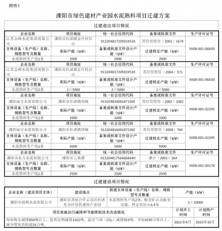 溧陽(yáng)市轄部分水泥熟料產(chǎn)能分步整合遷建