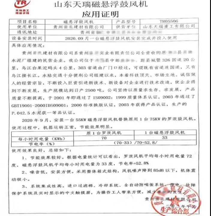 山東天瑞重工磁懸浮鼓風機在貴州某水泥廠應用為例(參見應用證明圖3),經天瑞重工技術人員現場精準勘測和技術論證后,用1臺55KW天瑞重工磁懸浮鼓風機替換原75KW羅茨風機,科學的安裝調試后,用電量由原羅茨風機用電量72KW/h,降低至現33KW/h,天瑞重工磁懸浮鼓風機節(jié)電率為52.8%(參見貴州某水泥現場安裝及應用證明圖3),節(jié)能效果顯著。