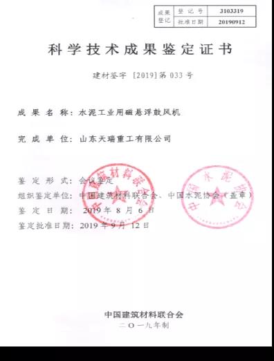 山東天瑞重工磁懸浮鼓風機在節(jié)能降噪方面一直是行業(yè)的標桿,2019年8月由中國建材聯(lián)合會和中國水泥協(xié)會組織召開“水泥工業(yè)用磁懸浮風機”科技成果評價會(鑒定證書參見圖4),評價結論為:天瑞重工磁懸浮項目的成功開發(fā)和應用,提升了我國水泥行業(yè)節(jié)能降噪水平,成果總體技術達到國際先進水平。