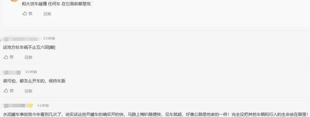 “很可怕,都怎么開車的,保持車距。”“水泥罐車事故我今年看到幾次了,說實話這些開罐車的確實開得快,馬路上喇叭隨便按,見車就超,好像公路是他家的一樣!完全沒把其他車輛和行人的生命放在眼里!”“和大貨車碰撞任何車在它面前都是紙。”