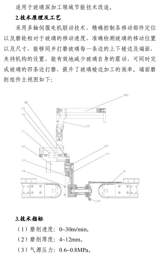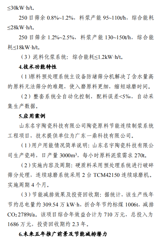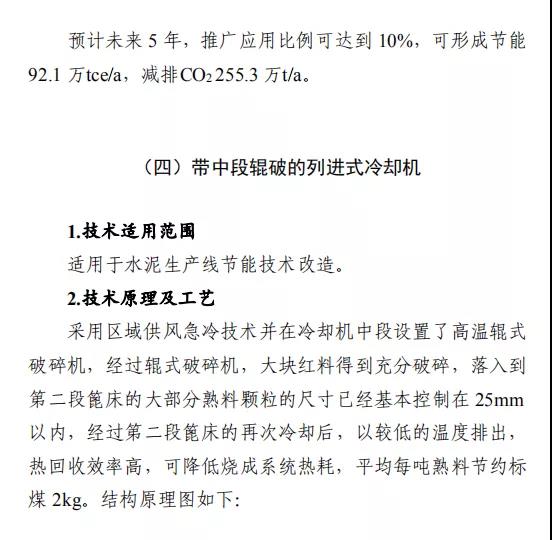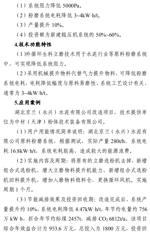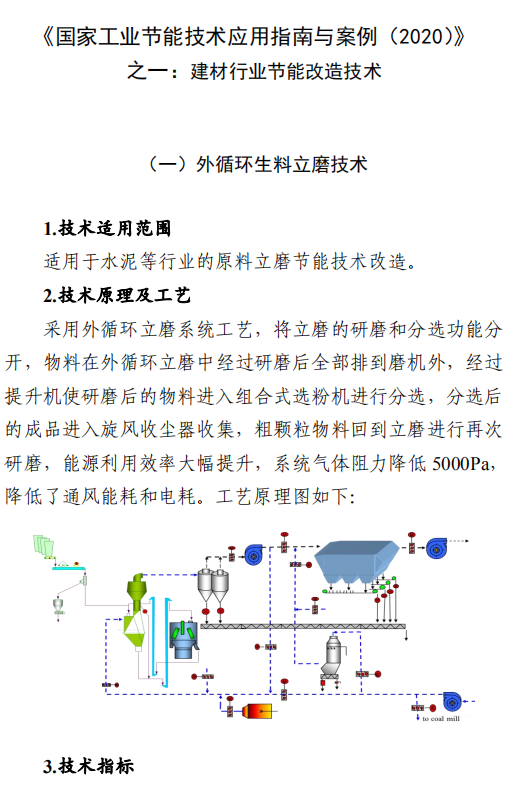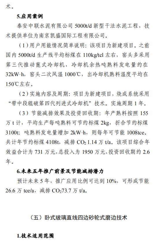 之一:建材行業(yè)節(jié)能改造技術(shù)外循環(huán)生料立磨節(jié)能技術(shù),采用外循環(huán)立磨系統(tǒng)工藝,將立磨的研磨和分選功能分開,系統(tǒng)氣體阻力降低5000Pa,通風(fēng)能耗和電耗降低,粉磨系統(tǒng)電耗降低3-4kW·h/t,能源利用效率大幅提升。在湖北京蘭(永興)水泥有限公司改造項目中,系統(tǒng)產(chǎn)量提升約10%,系統(tǒng)電耗降低4.47kW·h/t,年節(jié)約電量約756萬kW·h,折合年節(jié)約標(biāo)煤2457t,減排二氧化碳6812t/a。鋼渣/礦渣輥壓機終粉磨系統(tǒng)節(jié)能技術(shù),以輥壓機和動靜組合式選粉機為核心設(shè)備,輥面壽命可達(dá)立磨的2倍,具有廣泛的物料適應(yīng)性;全部物料為外循環(huán),除鐵方便,避免塊狀金屬富集;系統(tǒng)阻力低,節(jié)電效果明顯,礦渣微粉生產(chǎn)的系統(tǒng)電耗<35kW·h/t。在邯鄲市邦信建材有限公司礦渣粉磨及儲存(30萬t/a)項目中,鋼渣/礦渣輥壓機終粉磨系統(tǒng)年節(jié)約電量約120萬kW·h,折合年節(jié)約標(biāo)煤390t,減排二氧化碳1081t/a。陶瓷原料連續(xù)制漿系統(tǒng)節(jié)能技術(shù),采用自動精確連續(xù)配料、原料預(yù)處理系統(tǒng)、泥料/黏土連續(xù)化漿系統(tǒng)、連續(xù)式球磨方法等關(guān)鍵技術(shù),實現(xiàn)自動配料和自動出漿的功能,原料預(yù)處理系統(tǒng)綜合能耗≤4kW·h/t,250目篩余0.7%-0.9%、料漿產(chǎn)能85-100t/h連續(xù)球磨系統(tǒng)綜合能耗≤30kW·h/t,泥料化漿系統(tǒng)綜合能耗≤1.2kW·h/t,節(jié)能效果顯著。山東名宇陶瓷科技有限公司陶瓷原料節(jié)能連續(xù)制漿系統(tǒng)改造項目,生產(chǎn)線年節(jié)約總電量約309.54萬kW·h,折合年節(jié)約標(biāo)煤1006t,減排二氧化碳2789t/a。帶中段輥破的列進(jìn)式冷卻機節(jié)能技術(shù),采用區(qū)域供風(fēng)急冷技術(shù)并在冷卻機中段設(shè)置了高溫輥式破碎機,使大塊紅料得到充分破碎,落入到第二段篦床冷卻后,以較低的溫度排出,熱回收效率高,可降低燒成系統(tǒng)熱耗,平均每噸熟料節(jié)約標(biāo)煤2kg。在泰安中聯(lián)水泥有限公司5000t/d新型干法水泥工程項目中,系統(tǒng)運行穩(wěn)定,年節(jié)約標(biāo)煤4108t,減排二氧化碳1.14萬t/a。臥式玻璃直線四邊砂輪式磨邊技術(shù),采用多軸伺服電機聯(lián)動技術(shù),精確控制各移動部件定位以及磨輪相對于玻璃的移動速度,磨邊速度15-30m/min,玻璃所需磨邊時間平均20s/m2,可同時完成玻璃的四條邊打磨,提升了玻璃棱邊加工的效率。在廣宇洛玻(北京)工業(yè)玻璃有限公司改造項目中,該項目年節(jié)約標(biāo)煤46.8t,減排二氧化碳1170t/a。新型水泥熟料冷卻技術(shù)及裝備,采用新型前吹高效篦板、高效急冷斜坡、高溫區(qū)細(xì)分供風(fēng)、新型高溫耐磨材料、智能化“自動駕駛”、新型流量調(diào)節(jié)閥等技術(shù),熱回收效率高、輸送運轉(zhuǎn)率高、磨損低。在淶水冀東水泥有限公司篦冷機改造項目中,噸熟料工序電耗下降2.57kW·h,每年可節(jié)電370萬kW·h,折合標(biāo)煤1202.5t,工序標(biāo)煤耗下降2.81kg/tcl,每年可節(jié)約5100tce,余熱發(fā)電年增加發(fā)電量570萬kW·h,折合標(biāo)煤1852.5t。綜合年節(jié)約標(biāo)煤8155t,減排二氧化碳2.26萬t/a。