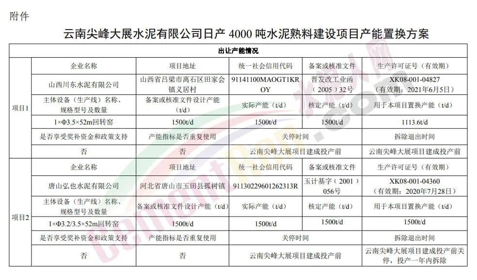 日前,云南工信廳發(fā)布《云南尖峰大展水泥有限公司日產(chǎn)4000噸熟料建設(shè)項(xiàng)目產(chǎn)能置換方案公示》稱,按照相關(guān)文件要求,現(xiàn)將“云南尖峰大展水泥有限公司日產(chǎn)4000噸熟料建設(shè)項(xiàng)目產(chǎn)能置換方案”予以公示。公示期為2020年11月25日至12月8日。如有異議,請(qǐng)于公示期內(nèi)向云南省工業(yè)和信息化廳反映,歡迎社會(huì)公眾進(jìn)行監(jiān)督。公示文件全文如下:
