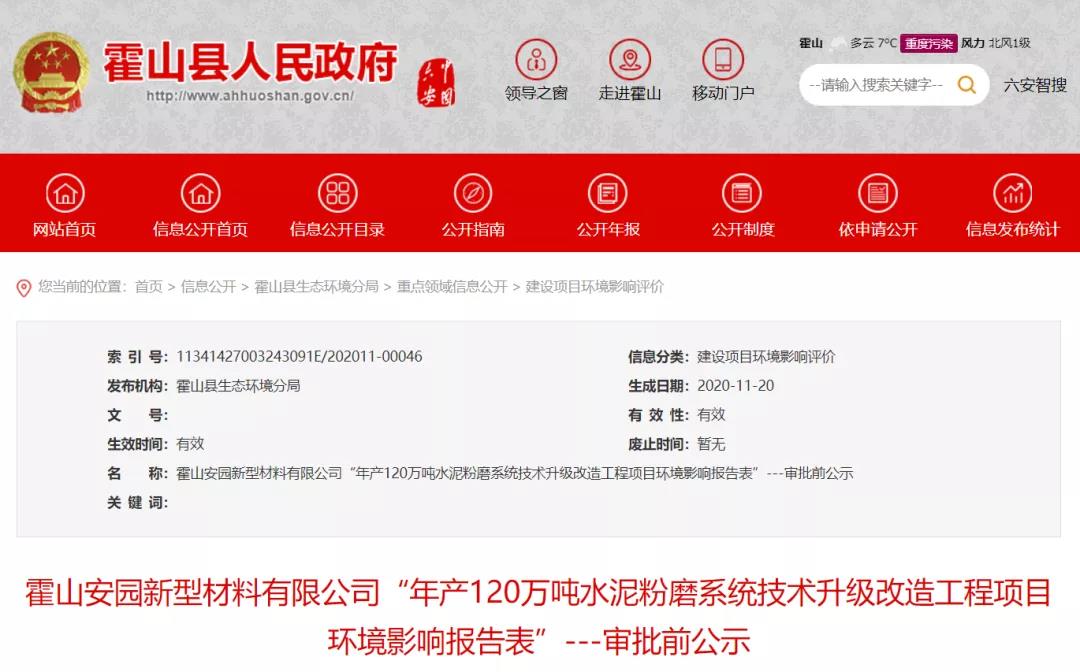 霍山縣人民政府網(wǎng)發(fā)布《霍山安園新型材料有限公司“年產(chǎn)120萬噸水泥粉磨系統(tǒng)技術(shù)升級(jí)改造工程項(xiàng)目環(huán)境影響報(bào)告表”---審批前公示發(fā)布》