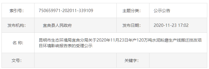 宜良縣政府官網(wǎng)發(fā)布《昆明市生態(tài)環(huán)境局宜良分局關(guān)于2020年11月23日年產(chǎn)120萬噸水泥粉磨生產(chǎn)線搬遷技改項(xiàng)目環(huán)境影響報(bào)告表的受理公示》