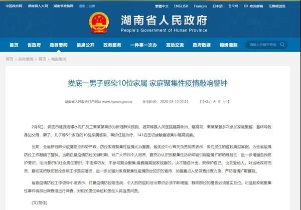 今年2月初,湖南自婁底漣源海螺水泥廠員工秦某某確診為新冠肺炎病例,被雙峰縣人民醫(yī)院隔離收治。隔離前,秦某某曾多次參加家庭聚餐,最終導致身邊父母、妻子、兒子等5個家庭的10位家屬感染確診住院治療,141名密切接觸者被集中隔離觀察。針對此案婁底市公案機關湖南省政府分別發(fā)布通告及警示。