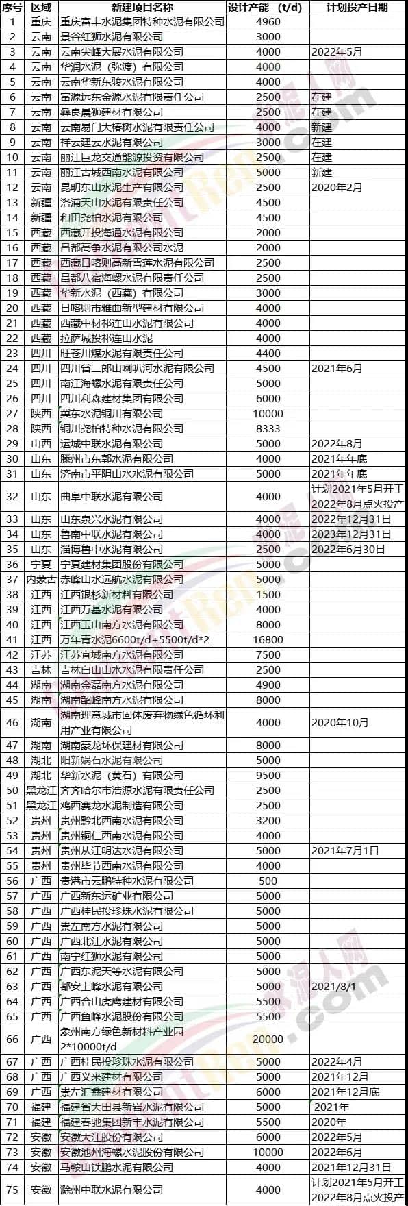 截止目前,包括已建成和在建項目國內(nèi)已經(jīng)有20條以上日產(chǎn)萬噸水泥生產(chǎn)線了。據(jù)水泥人網(wǎng)不完全統(tǒng)計,近兩年公示公告且在2020~2023年內(nèi)投產(chǎn)的項目約75條生產(chǎn)線,產(chǎn)能合計共11087.79萬噸/年。近日,又有15個新建粉磨站落地,項目投建方包括中聯(lián)、西南、華新、堯柏等多家集團企業(yè),合計產(chǎn)能共3355萬噸/年,部分新建產(chǎn)能名單如下: