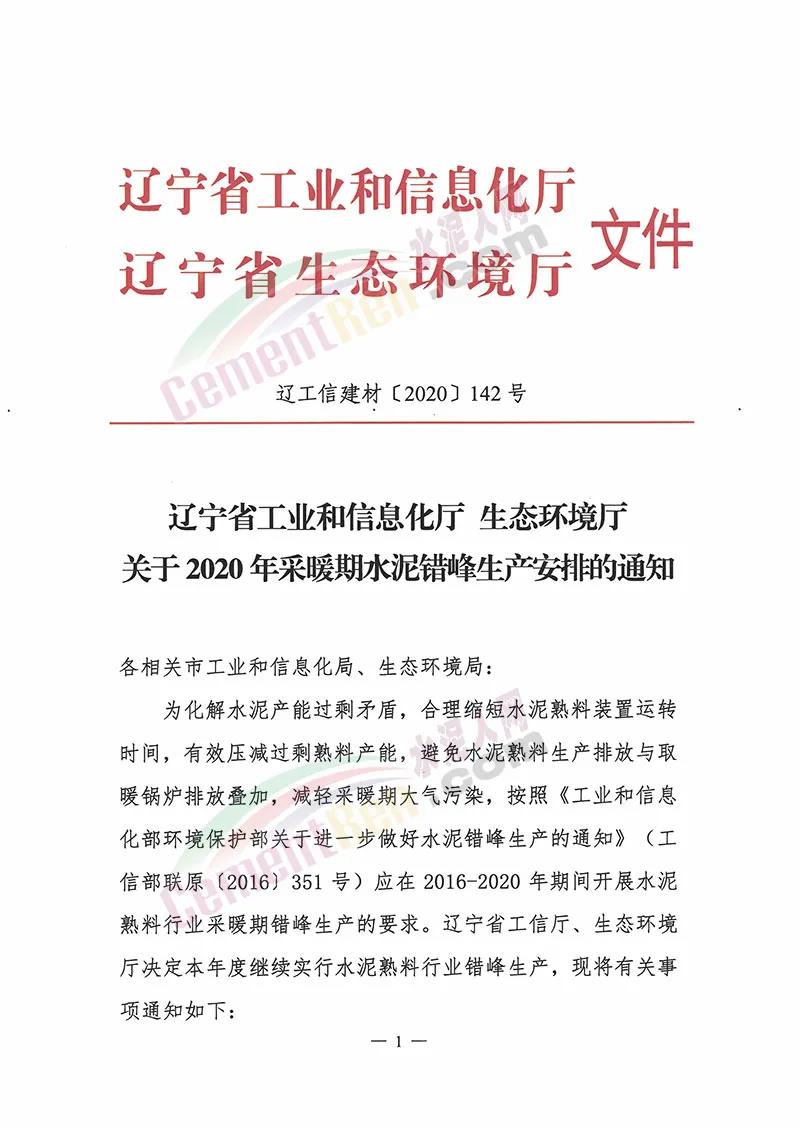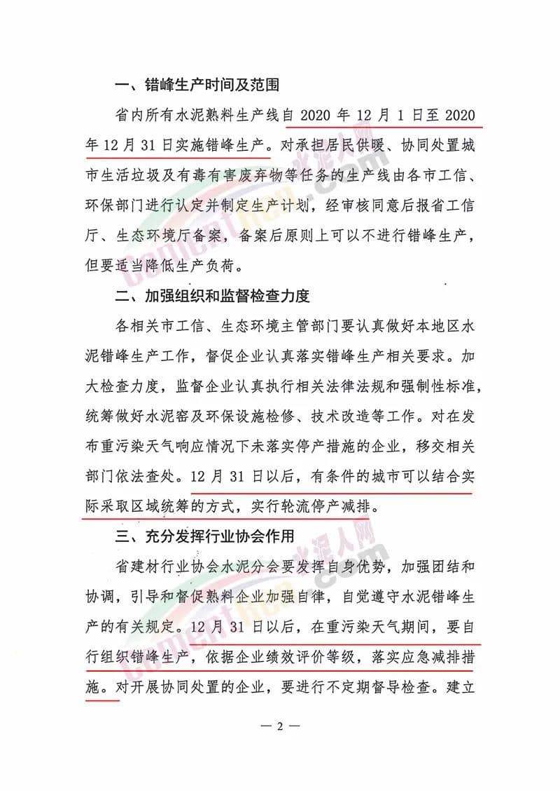省內(nèi)所有水泥熟料生產(chǎn)線自2020年12月1日至2020年12月31日實(shí)施錯(cuò)峰生產(chǎn)。對承擔(dān)居民供暖、協(xié)同處置城市生活垃圾及有毒有害廢棄物等任務(wù)的生產(chǎn)線由各市工信、環(huán)保部門進(jìn)行認(rèn)定并制定生產(chǎn)計(jì)劃,經(jīng)審核同意后報(bào)省工信廳、生態(tài)環(huán)境廳備案,備案后原則上可以不進(jìn)行錯(cuò)峰生產(chǎn),但要適當(dāng)降低生產(chǎn)負(fù)荷。