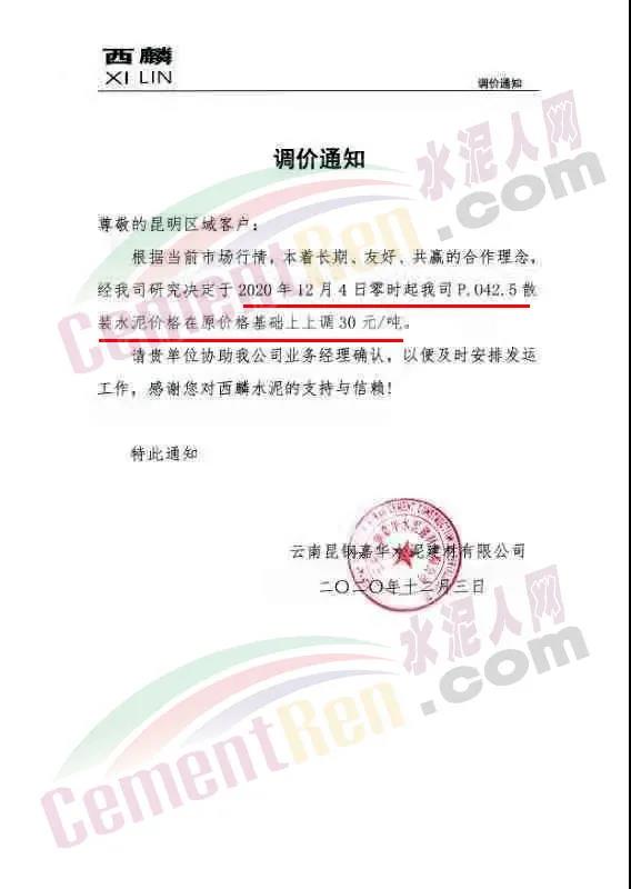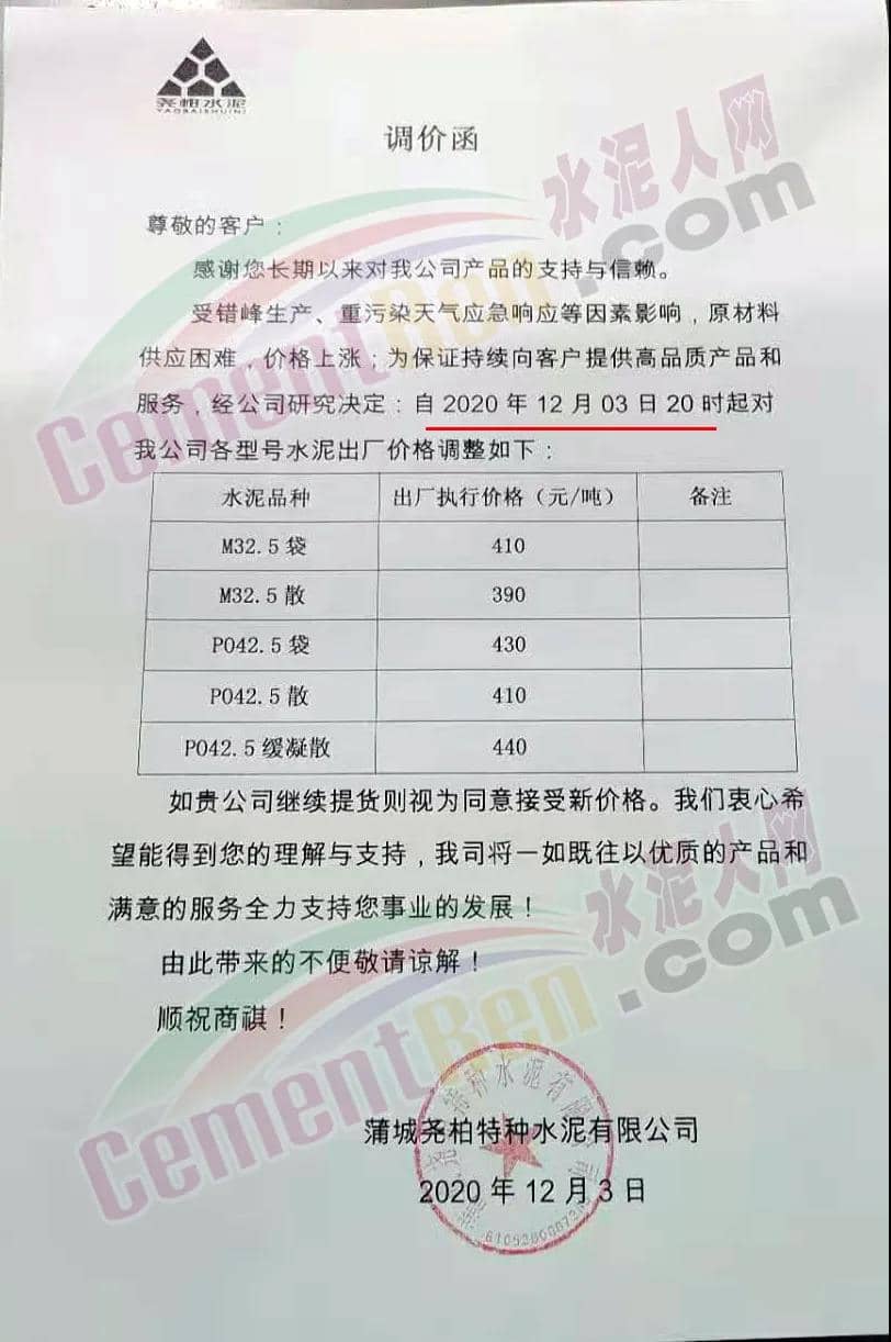 我公司從2020年12月3日14時起,針對P.O42.5散裝水泥產(chǎn)品出廠價調(diào)整至最低405元/噸,其他產(chǎn)品在原價格基礎(chǔ)上上調(diào)60元/噸。