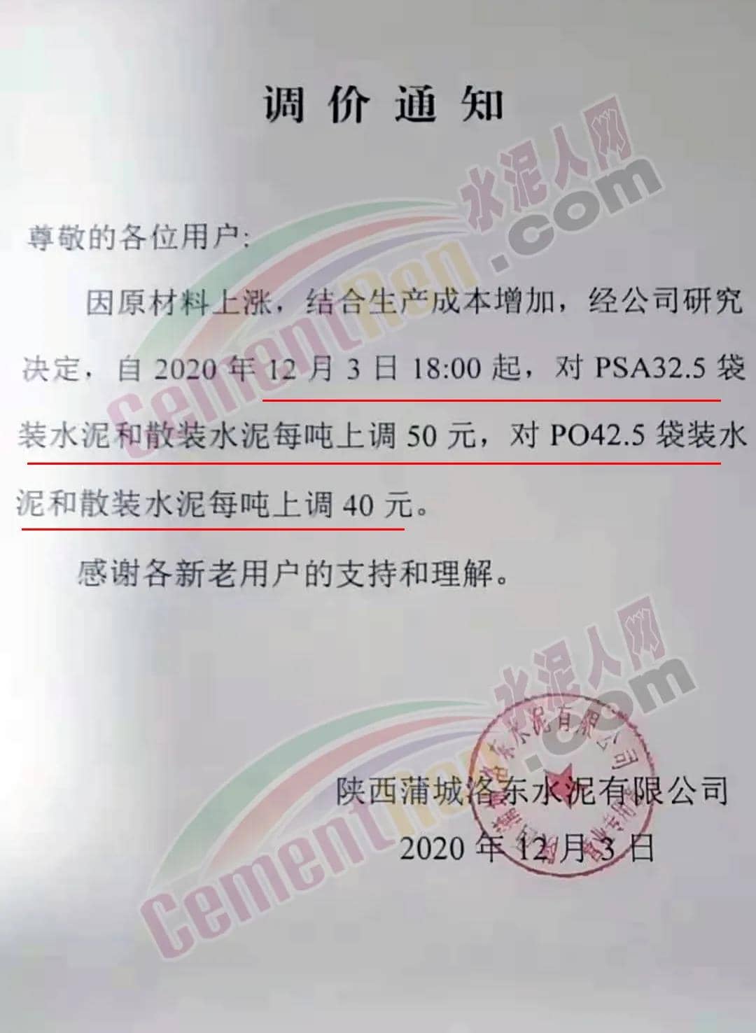 蒲城洛東水泥通知自12月3日下午18時起,對PSA32.5袋裝水泥有散裝水泥上調(diào)50元/噸,對PO42.5袋裝水泥和散裝水泥上調(diào)40元/噸。