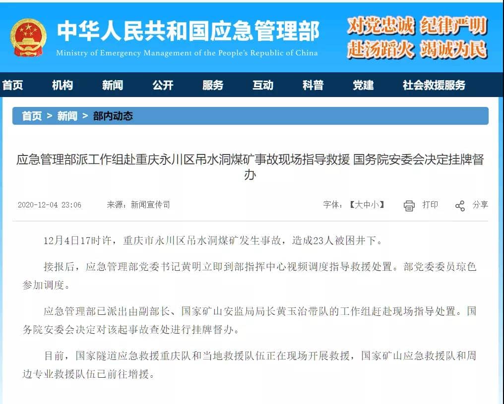 接報(bào)后,應(yīng)急管理部黨委書(shū)記黃明立即到部指揮中心視頻調(diào)度指導(dǎo)救援處置。部黨委委員瓊色參加調(diào)度。應(yīng)急管理部已派出由副部長(zhǎng)、國(guó)家礦山安監(jiān)局局長(zhǎng)黃玉治帶隊(duì)的工作組趕赴現(xiàn)場(chǎng)指導(dǎo)處置。國(guó)務(wù)院安委會(huì)決定對(duì)該起事故查處進(jìn)行掛牌督辦。目前,國(guó)家隧道應(yīng)急救援重慶隊(duì)和當(dāng)?shù)鼐仍?duì)伍正在現(xiàn)場(chǎng)開(kāi)展救援,國(guó)家礦山應(yīng)急救援隊(duì)和周邊專(zhuān)業(yè)救援隊(duì)伍已前往增援。