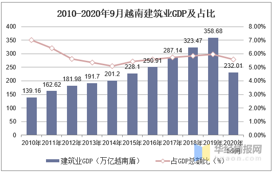 2010-2020年9月越南建筑業(yè)GDP及占比