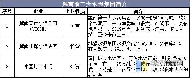 越南前三大水泥集團分別為國營越南國家水泥公司(VICEM),私營的越南凱撒水泥集團和外資背景的泰國城市水泥: