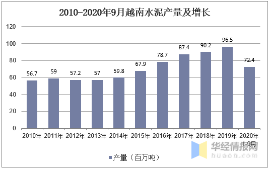 2010-2020年9月越南水泥產(chǎn)量及增長
