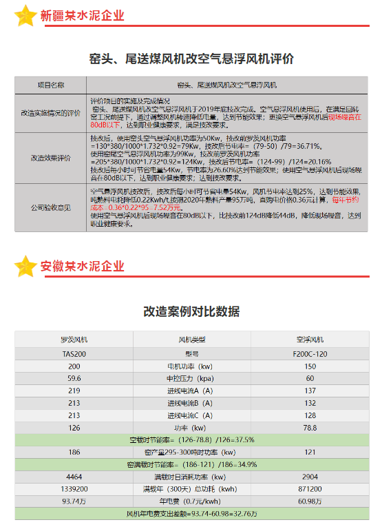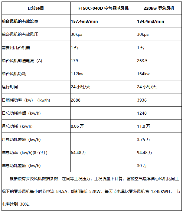 經(jīng)測試:管道壓力27KPa運行時(與羅茨風機管道壓力相同),空氣懸浮風機節(jié)能32.5%。1、同等工況運行時,空氣懸浮風機比羅茨風機功率節(jié)能30%以上。2、空氣懸浮風機引用高效葉輪直接連接功能,省去了中間傳動裝置,具有無機械接觸、無振動、無需潤滑、易于按裝等特性,其噪聲由原先110分貝降低到78分貝,遠低于國家規(guī)定噪音限值80分貝,同時減少了對設(shè)備維護保養(yǎng)頻率,節(jié)省潤換系統(tǒng)使用的潤換油,避免生產(chǎn)現(xiàn)場的二次污染等。