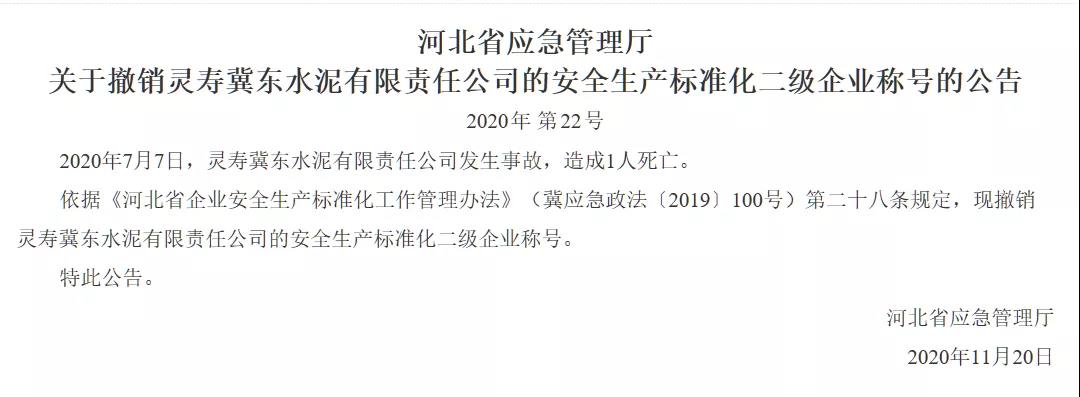 據(jù)悉,上述三家企業(yè)均在2019年發(fā)生安全生產(chǎn)亡人事故:8月10日,利比玻璃制品(中國(guó))有限公司發(fā)生高處墜落事故,造成1人死亡;10月24日,河北興華鋼鐵有限公司燒結(jié)球團(tuán)發(fā)生火災(zāi)事故,造成7人死亡;10月31日,保定天威保變電氣股份有限公司發(fā)生起重傷害事故,造成1人死亡。依據(jù)《河北省企業(yè)安全生產(chǎn)標(biāo)準(zhǔn)化工作管理辦法》,上述三家企業(yè)均不再具備二級(jí)企業(yè)安全生產(chǎn)標(biāo)準(zhǔn)化條件。